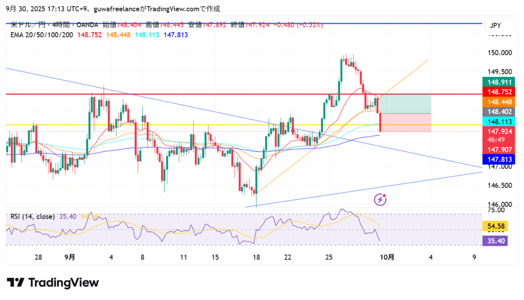 - 4時間足で三尊形成 → 下落トレンド優勢なのは認識していた。