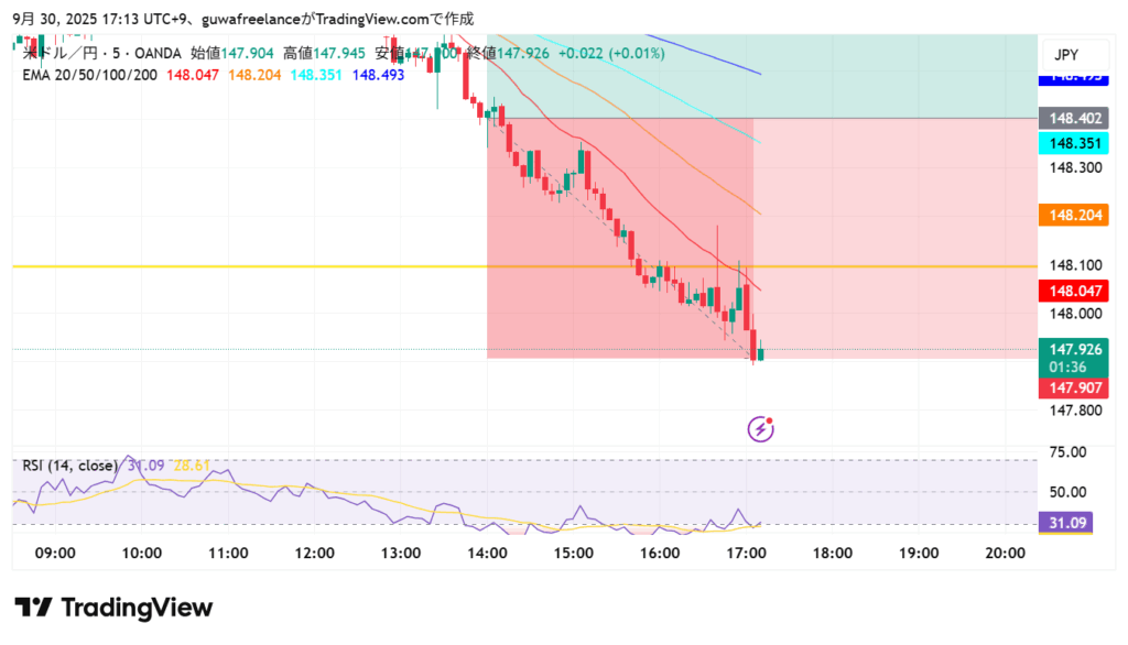 - 本来の損切りは直近安値(147.400付近)に置くべきだった。