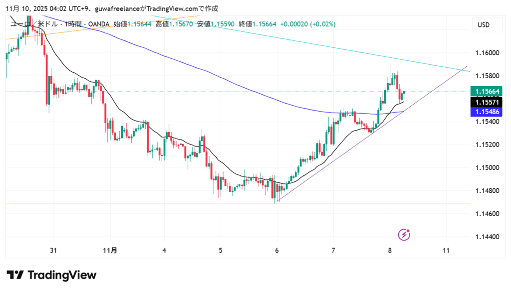 ⚖️ 1時間足:短期ロング中だが、1.158を上抜けできるかが分岐点。