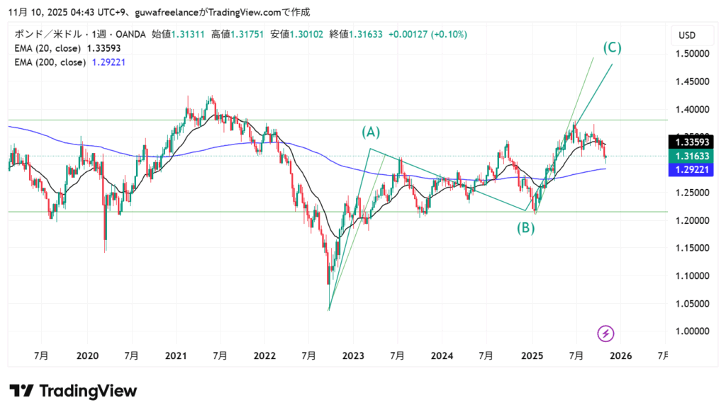 - 2023年から続いた上昇波(A→B→C)は3波目がすでに伸びきり、現在は調整入りと見られる。