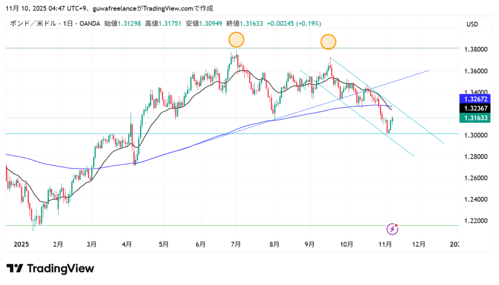中期では売り圧力がやや強まりつつある。 - 10月30日〜11月5日の間、横軸調整が長く続いており、