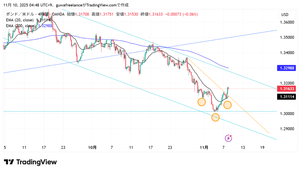 - 4時間足: 逆三尊気味の反発上昇。ネックライン上抜け済でリターンムーブ待ちのロング候補。