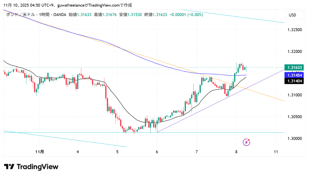 | 1時間足 | ロング(短期) | 上昇トレンドラインを維持中 |