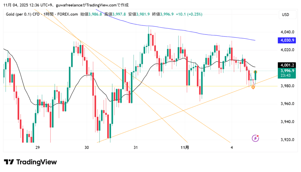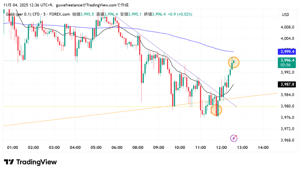 1回目はしの前の3980あたりでいったん3985あたりまで伸びたけど建値に戻ってきたから決済。
