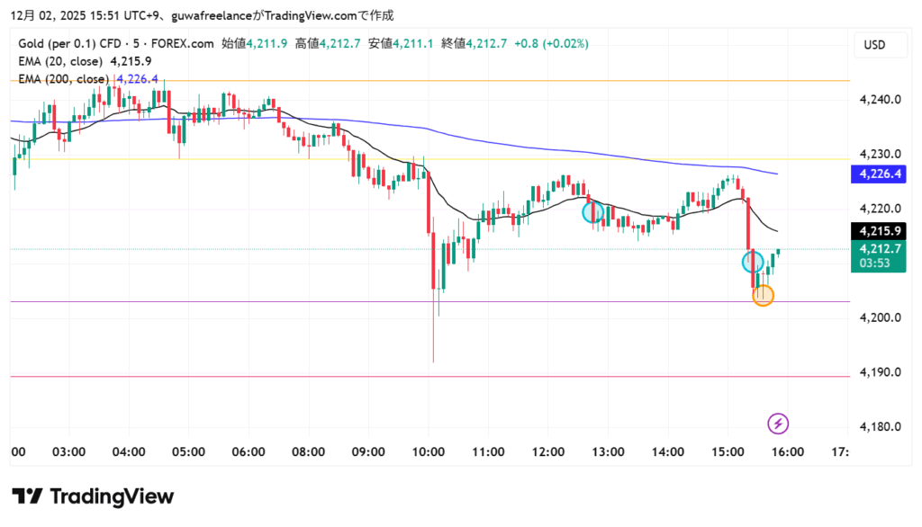 - 5分足で一度大きく落とした後に反発してきたため、