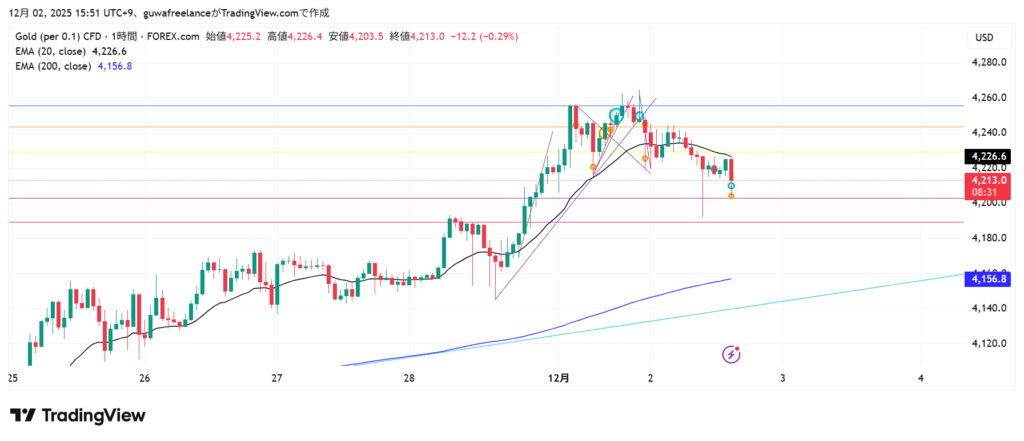 - 1時間足では20EMAの下に潜り、短期は下降の勢いが残る形。
