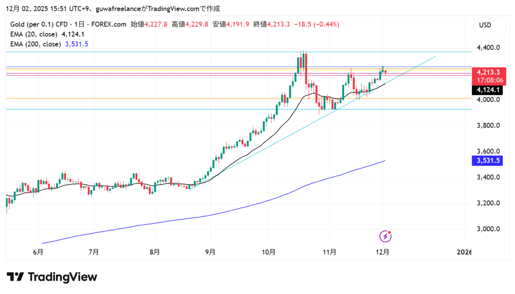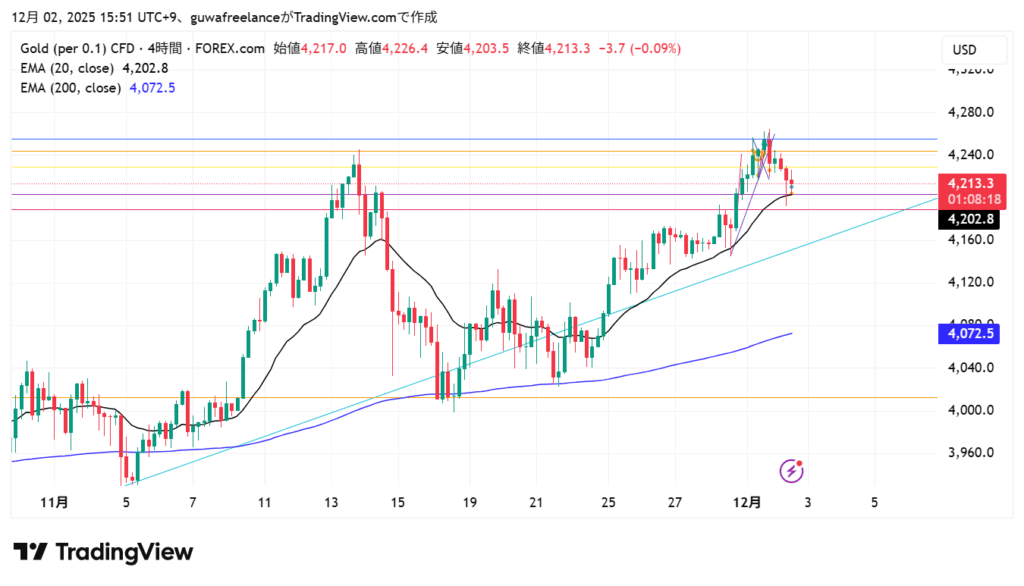 - 4時間足・日足は上昇トレンド継続の中での調整局面。