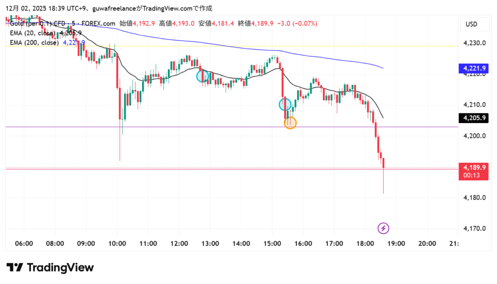 - 5分足では反発に見えても、**1分足ではずっと強い下落(連続の陰線)**だった。