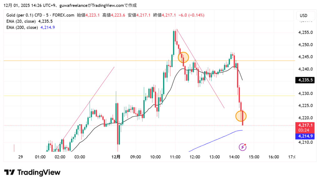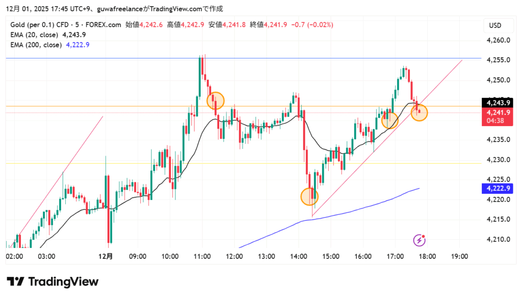 5分足で一旦4255まで行ってる → これで抜けたと判断した