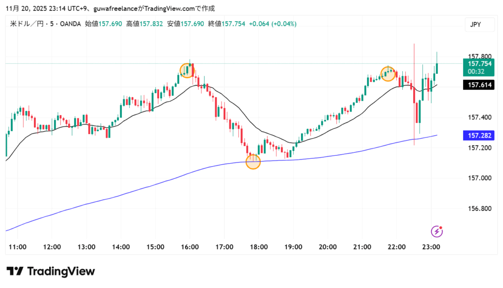 5分足の1個目の〇で0.5ショートエントリー2個目の〇で利確待つ。3個目の〇で建値で切る。
