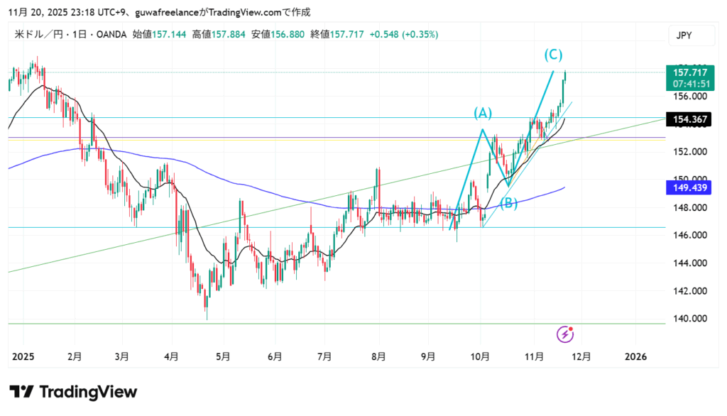 日足でエリオット波動の上昇3波がもう伸び切ったところ。
