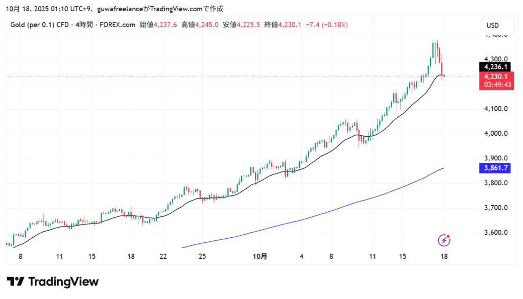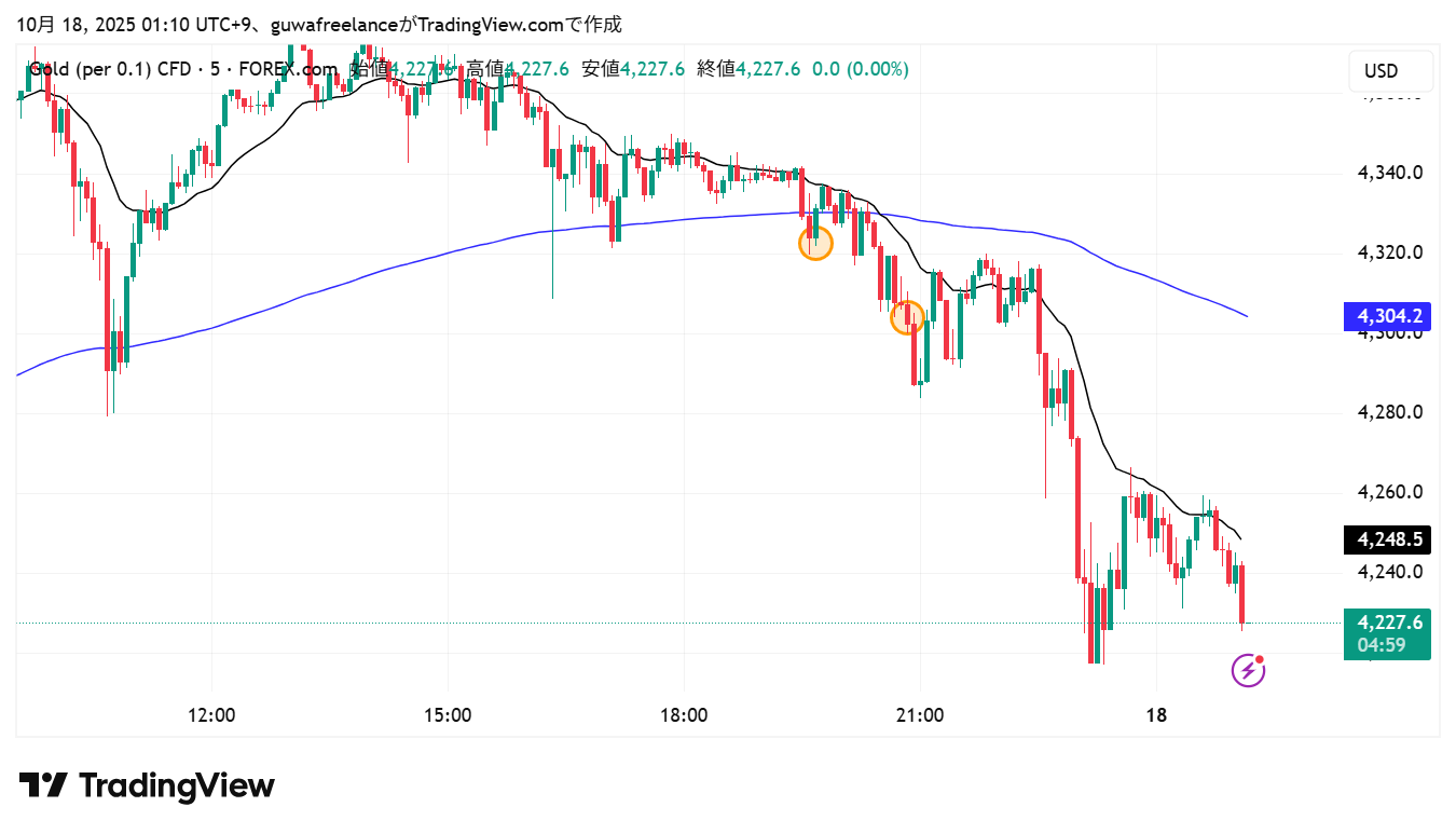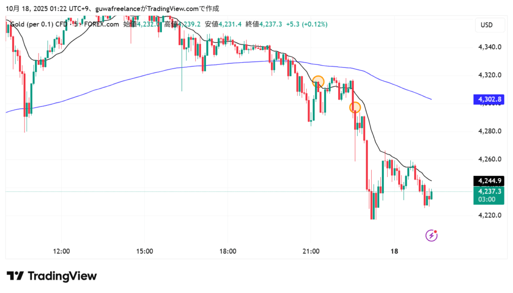 - 4,315 → 4,298 付近で利確。約17〜18pips。