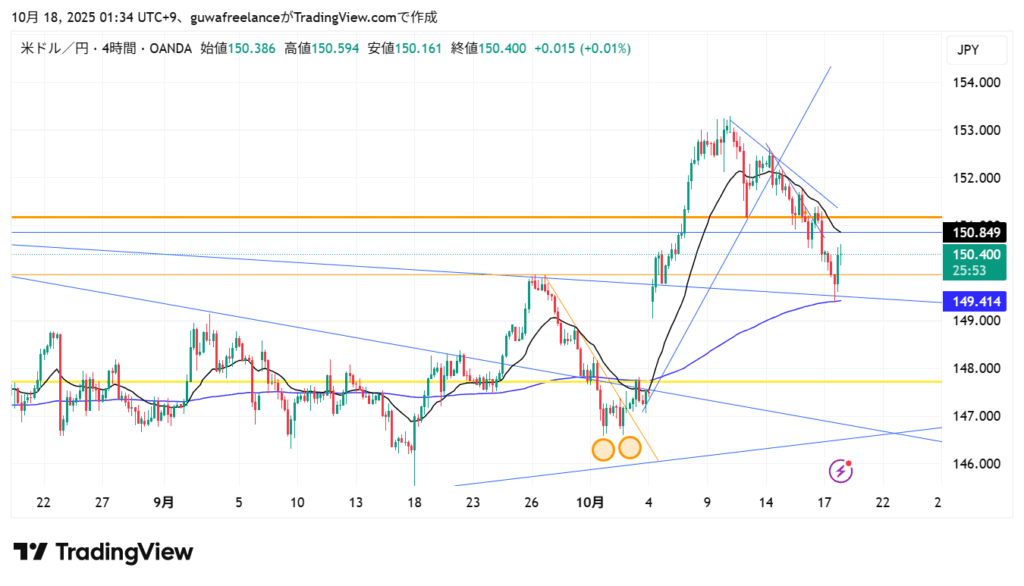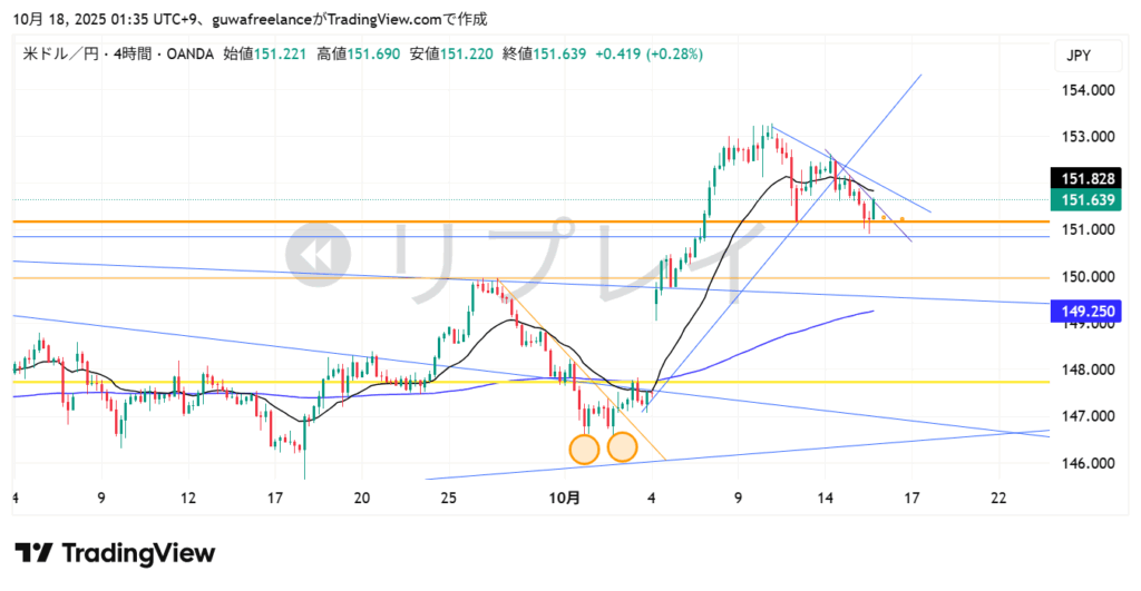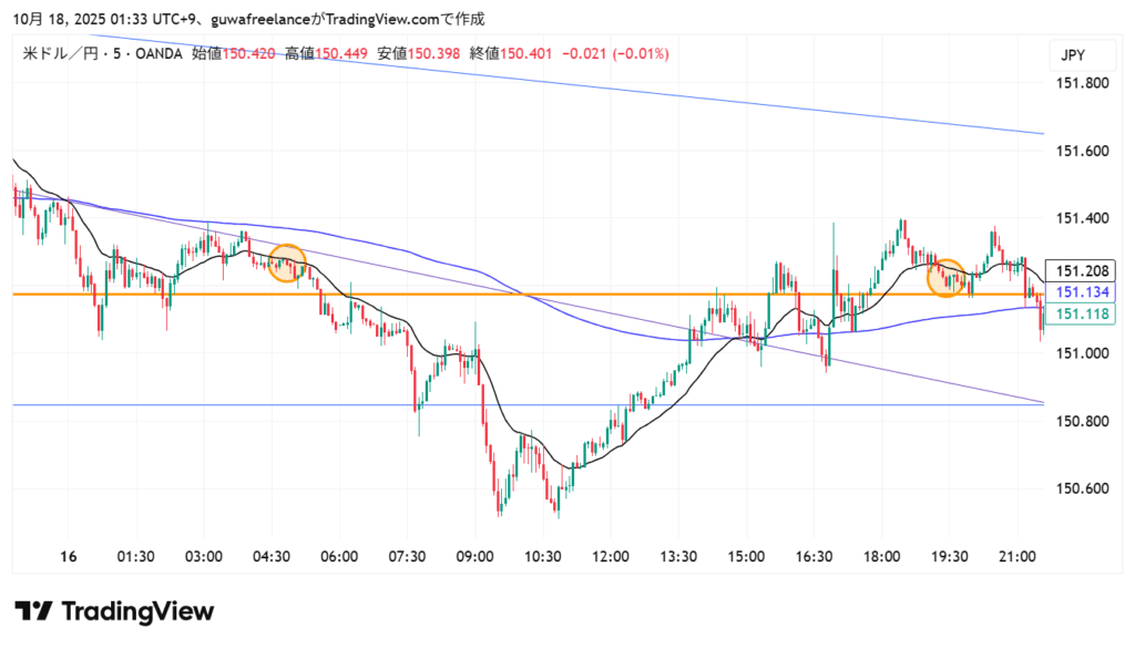 **151.0付近のサポート(過去の安値ライン)**で反発を複数回確認。 - 「意外とこのライン硬いな」と感じ、ショートを見送りロングに切り替え。