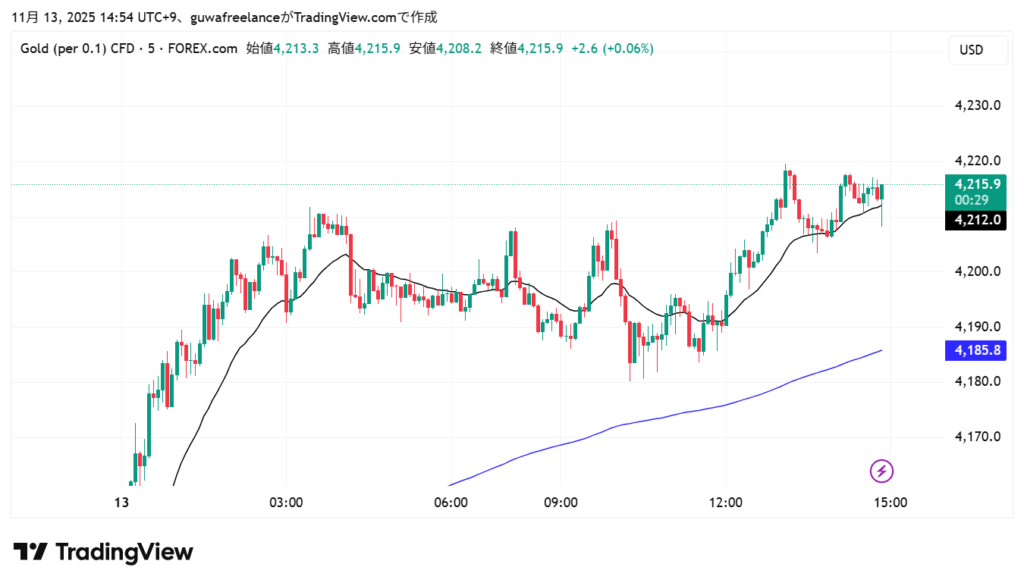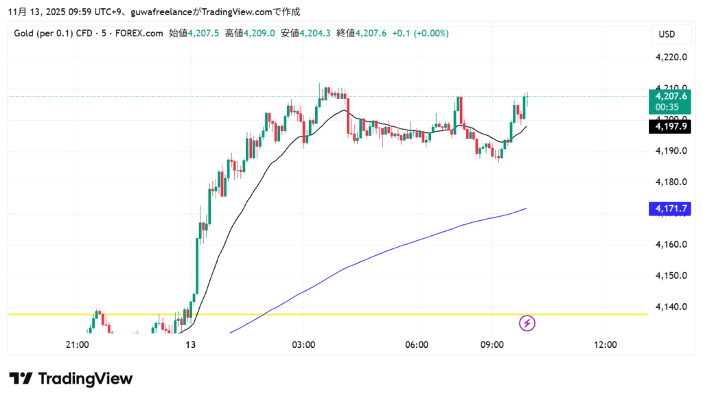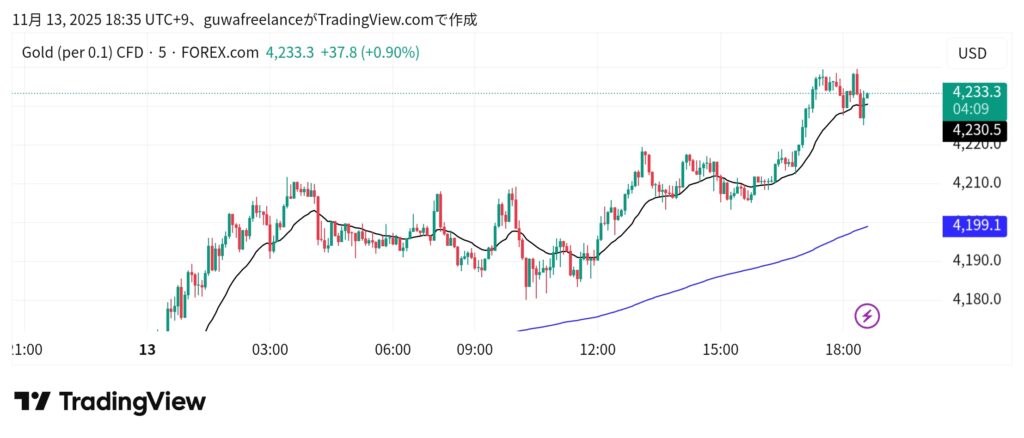 4210くらいでロングエントリー。落ちてきたヒゲで建値決済
