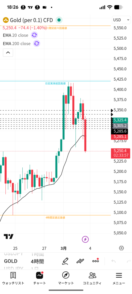 FX2026.03.03順張りやのにな ゴールド0.1ロットロング 負け×2 ゴールド0.25ロット マイナス010万 3月4戦2勝3敗1引き分け マイナス10万 順張りでエントリーしたはずやけど負けました。こんなもんよfx 2戦目↓ はいストレート負け。fx無理や勝ち全部無いなった ↓3回目 取り戻そうとして10万0.25ロットロング。刈られました。引退です