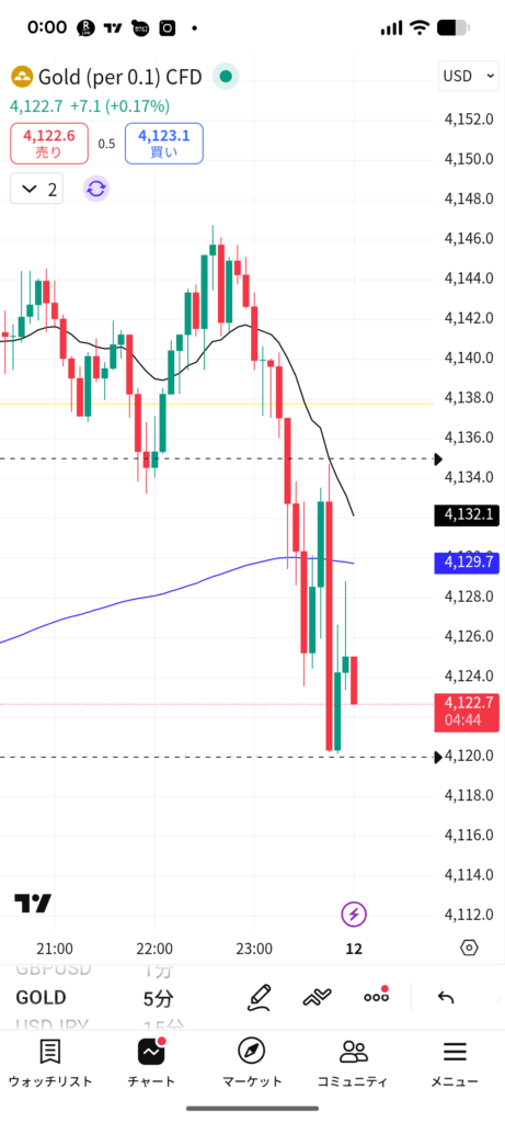 ゴールド0.1ロットロング 勝ち +6万円くらい 22戦5勝2敗15分 もつれてたとこにショート勢のロスカ狙って