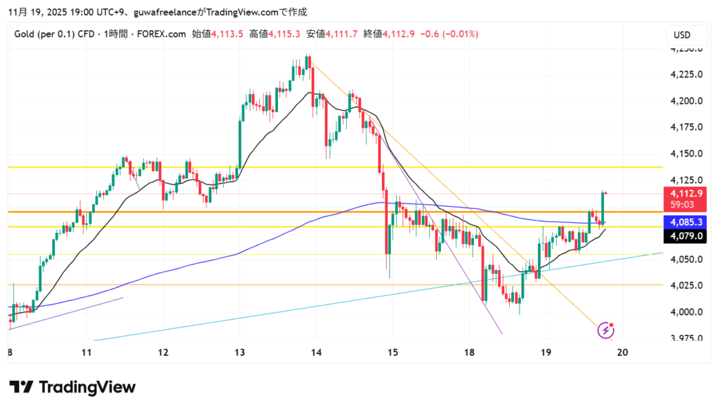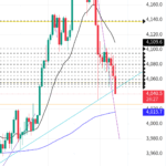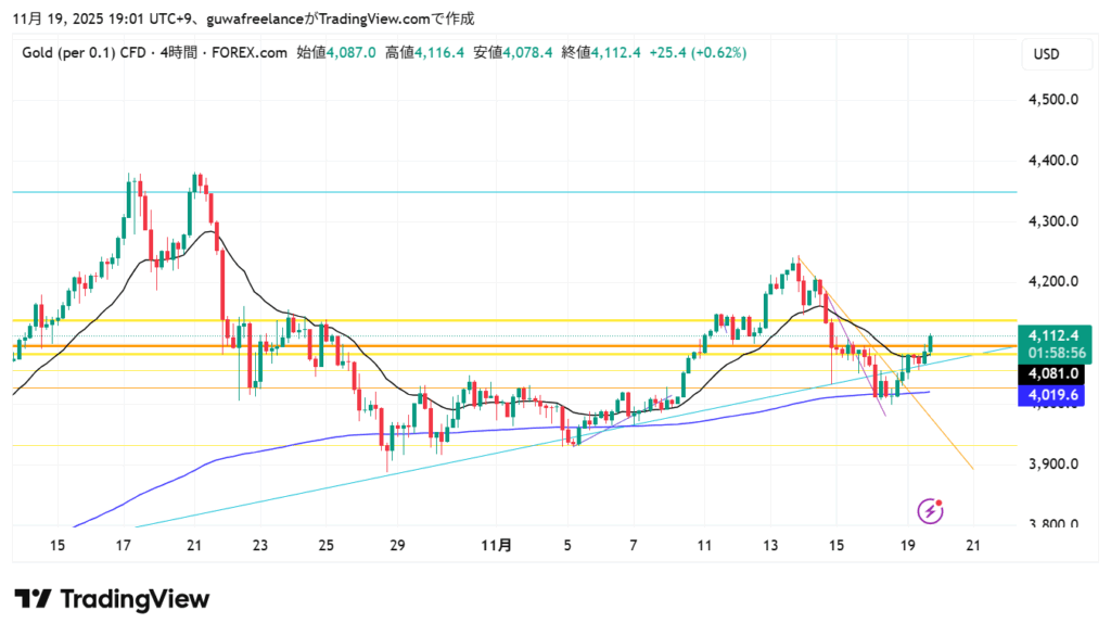 - 直近高値(黄色の太めのライン)を超えれば、4100〜4110まで空白地帯。